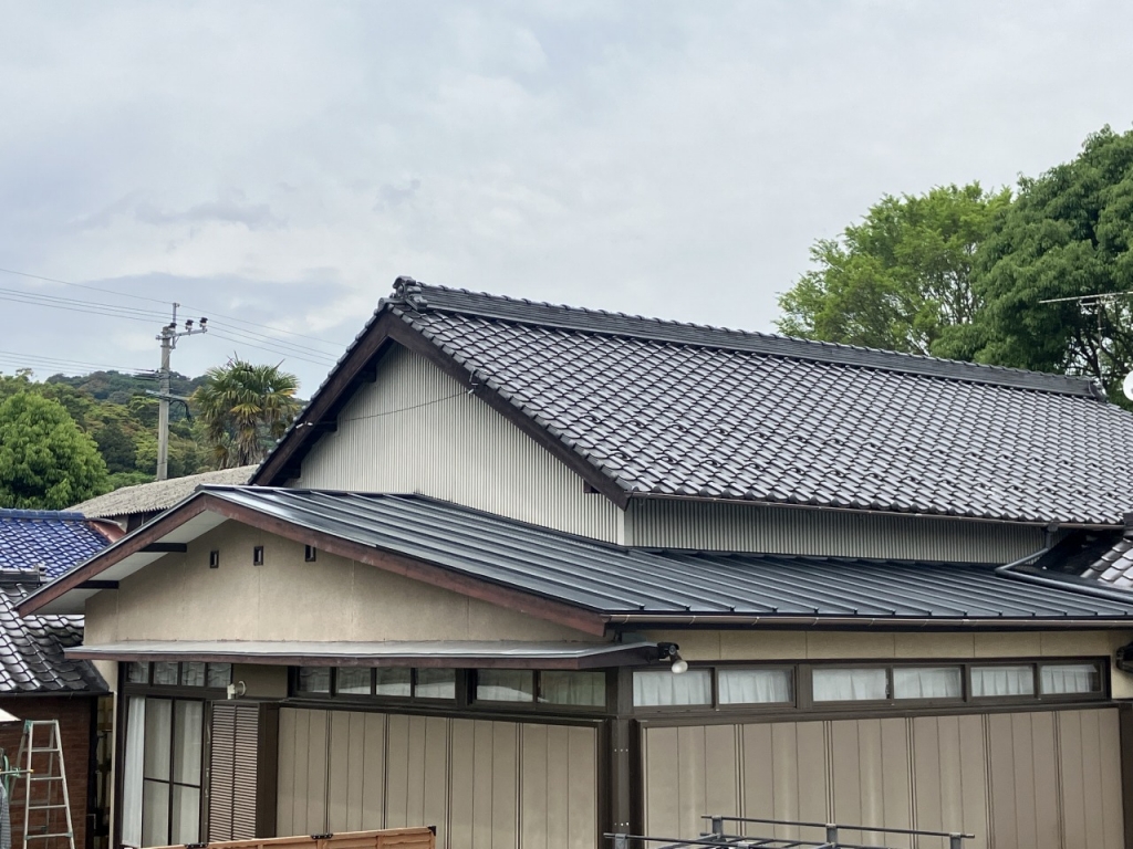 元のお色に近い色で塗装しているのでわかりにくいですがガルバ瓦屋根、庇板金、軒天塗装です。