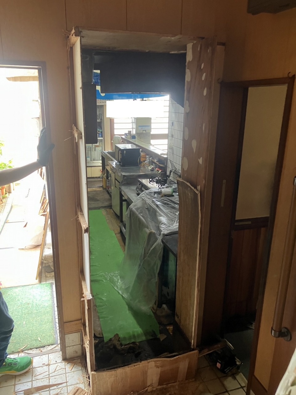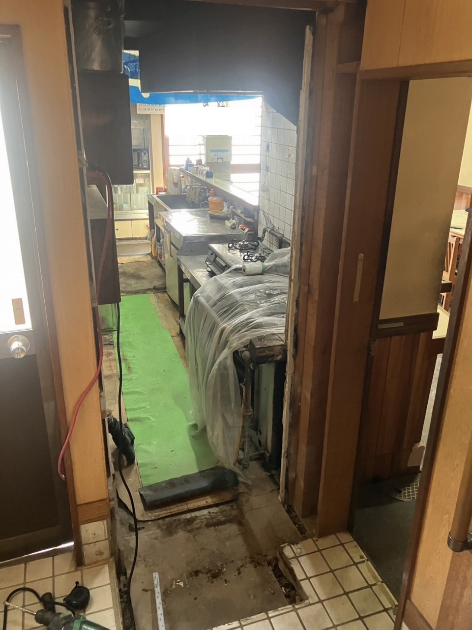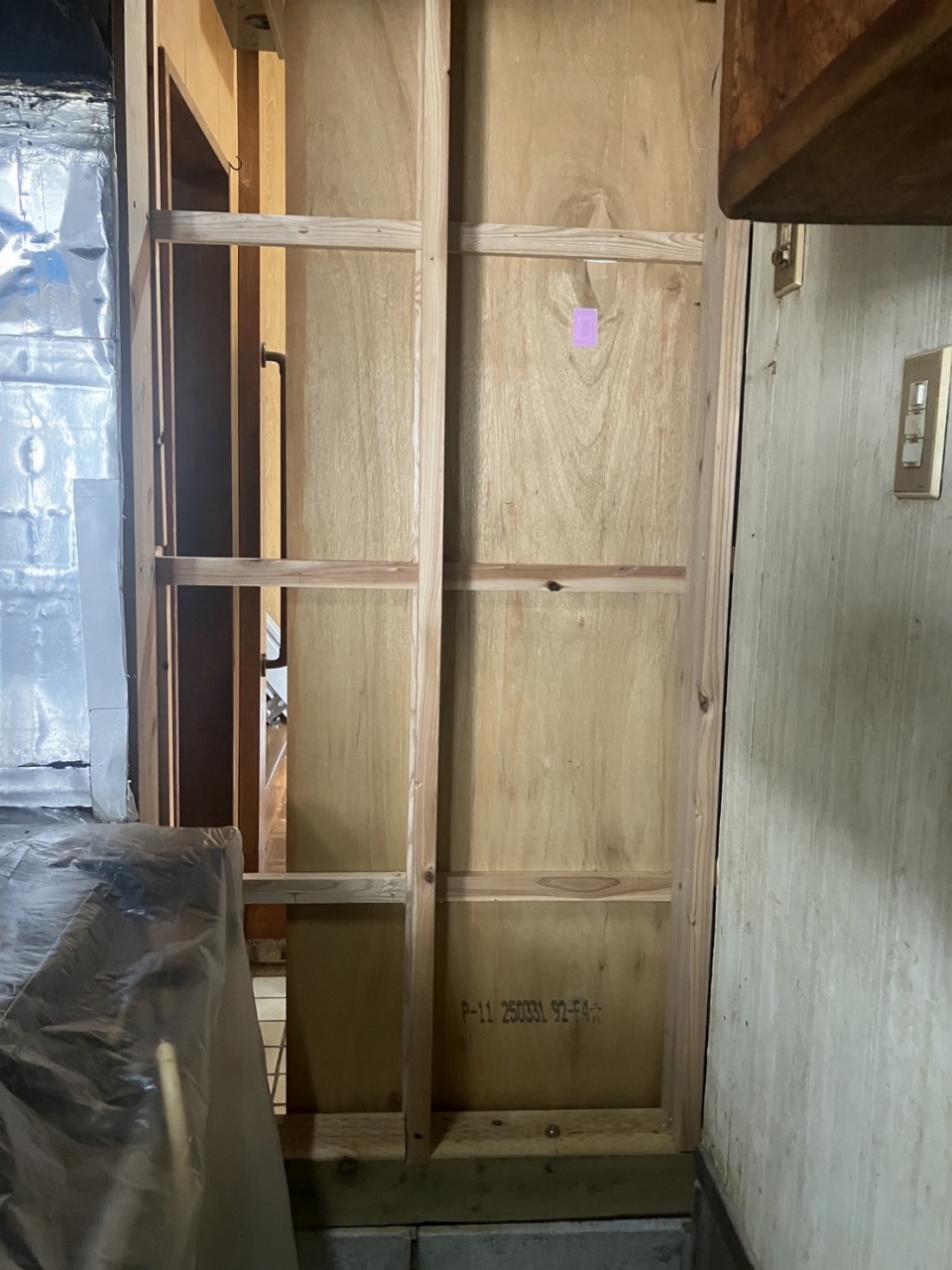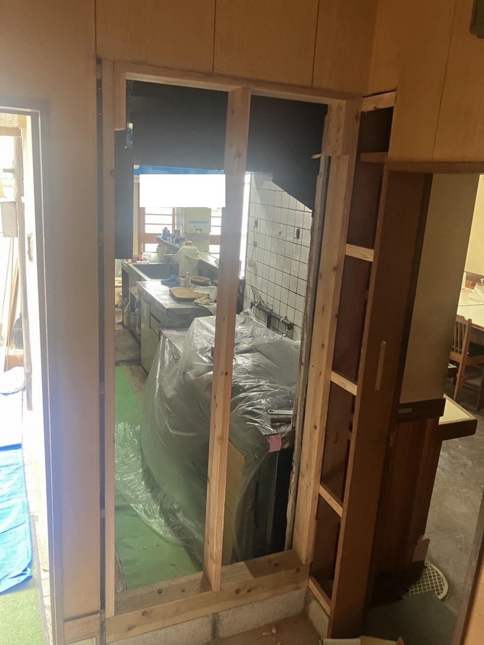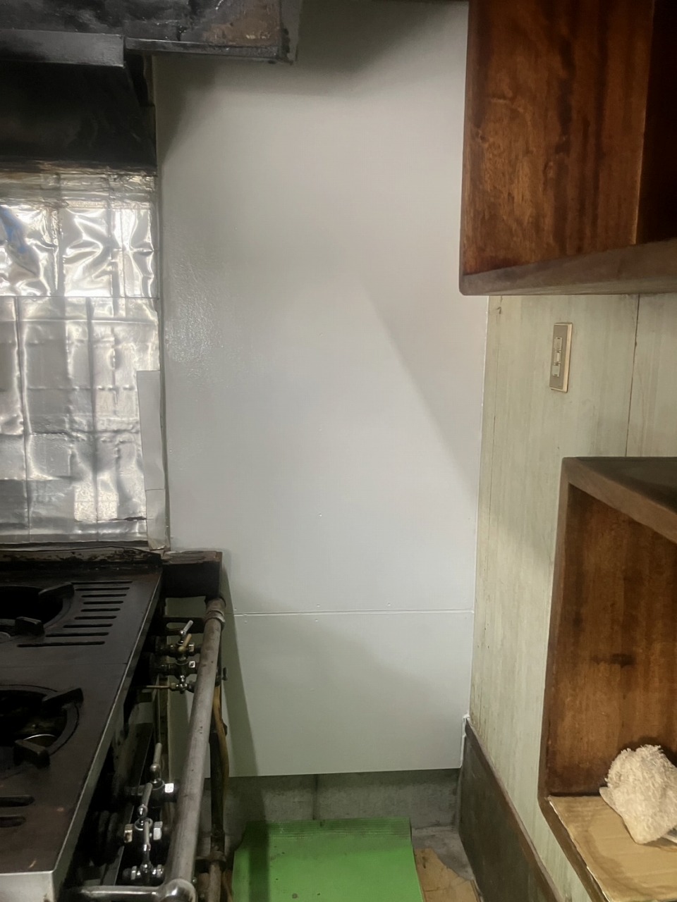 旧厨房側壁張り工事 防火板張り
